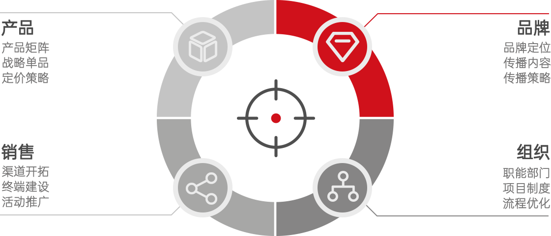消費者是通過品牌與產品了解企業,所以要解決企業經營層面的問題,必須在組織內部,圍繞戰略定位重新規劃各項運營動作,并系統規劃資源配置。北洲咨詢將主要協助企業重新制定品牌傳播、產品規劃、營銷渠道調優及組織
